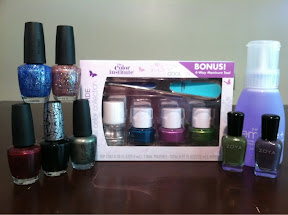 Finally, my last nail mail was a box set from Kohl's. I had Kohl's bucks to use and decided to grab this kit and see how I liked The Color Institute polishes that they sell there. The collection is called Avant Garde but the colors are not individually named. It came with a blue, purple, green, clear top coat, and a 4 way nail buffer file.